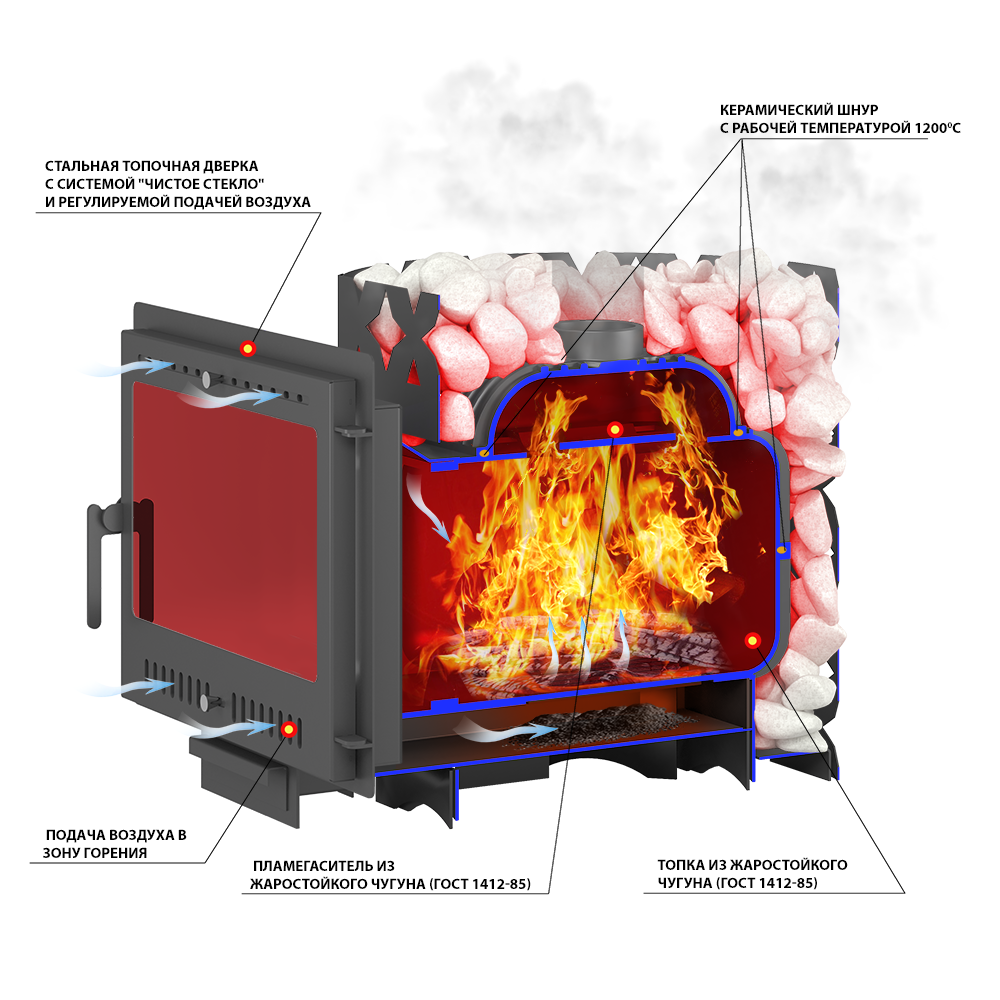 Чугунные печи ЭТНА производятся в России на современном литейном оборудовании. Печи для бани изготовлены из качественного литьевого чугуна толщиной не менее 6-8 мм. Топочный тоннель сделан из особо прочной стали, предусматривает длительный срок службы. Длина тоннеля рассчитана на простой и удобный монтаж печи ЭТНА с выходом в предбанник. Корпус печи состоит из трёх элементов, собираемых на болтовых соединениях. При сборке между элементами корпуса прокладывается термостойкий керамический шнур,предотвращающий прорыв дымовых газов и пламени в помещение.