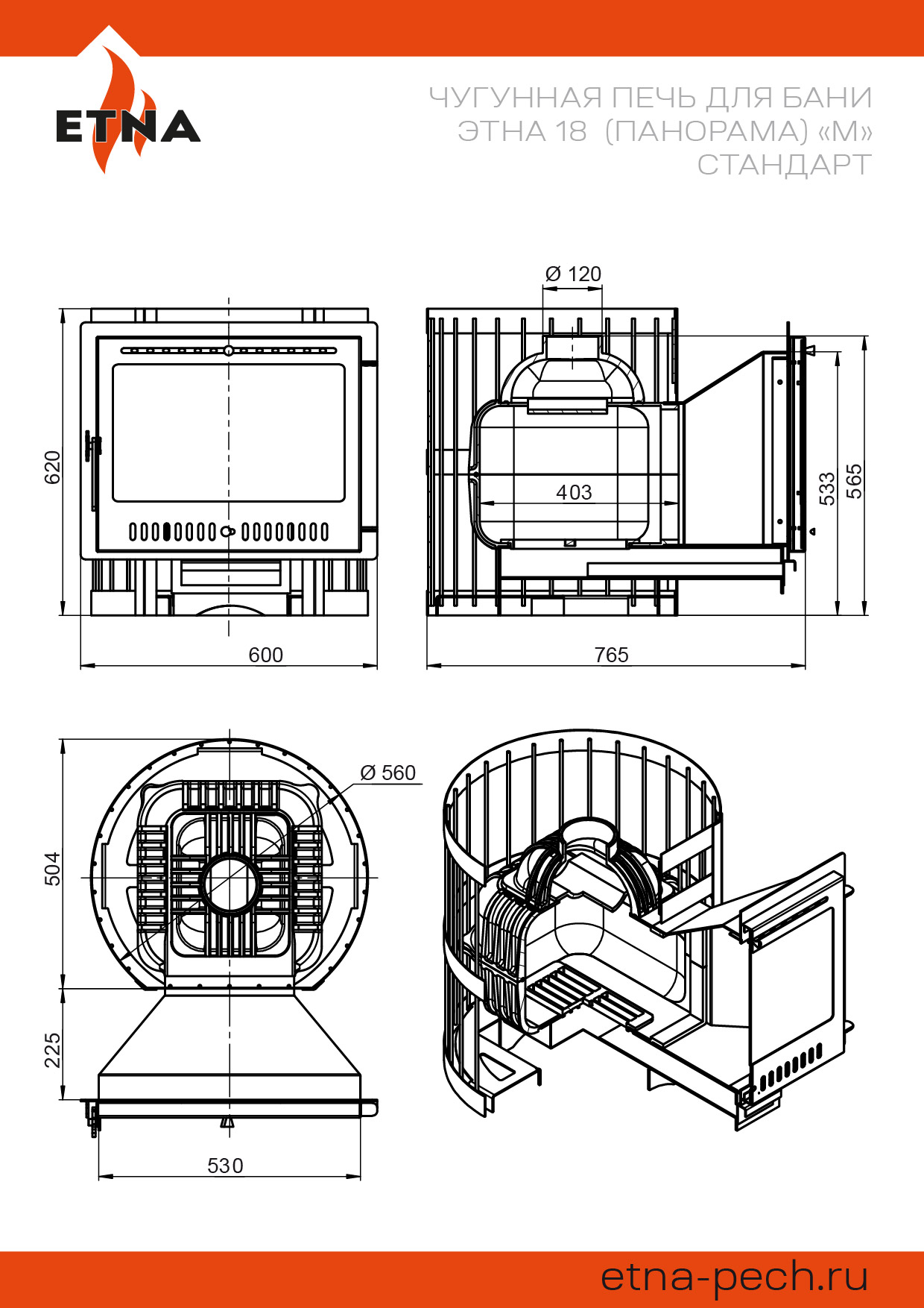 Чугунная банная печь ЭТНА 18 (Панорама) М рассчитана на работу в парной объёмом до 18 м3. Дверка из особо прочной котловой стали 09Г2С с панорамным стеклом. Для устройства наружной открытой каменки печь ЭТНА 18 оснащается металлическим кожухом с прорезным рисунком оригинального дизайна. Пространство между печью и кожухом из двухмиллиметровой стали заполняется камнями для бани, которые выполняют роль теплонакопителя и защищают парящихся от жёсткого инфракрасного излучения. Кожух диаметром 600 миллиметров вмещает в себя до 120 килограммов камней крупной и средней фракции.