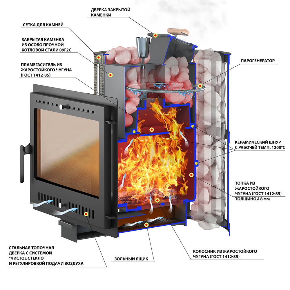 Материал закрытой каменки: Особо прочная котловая сталь (09Г2С).