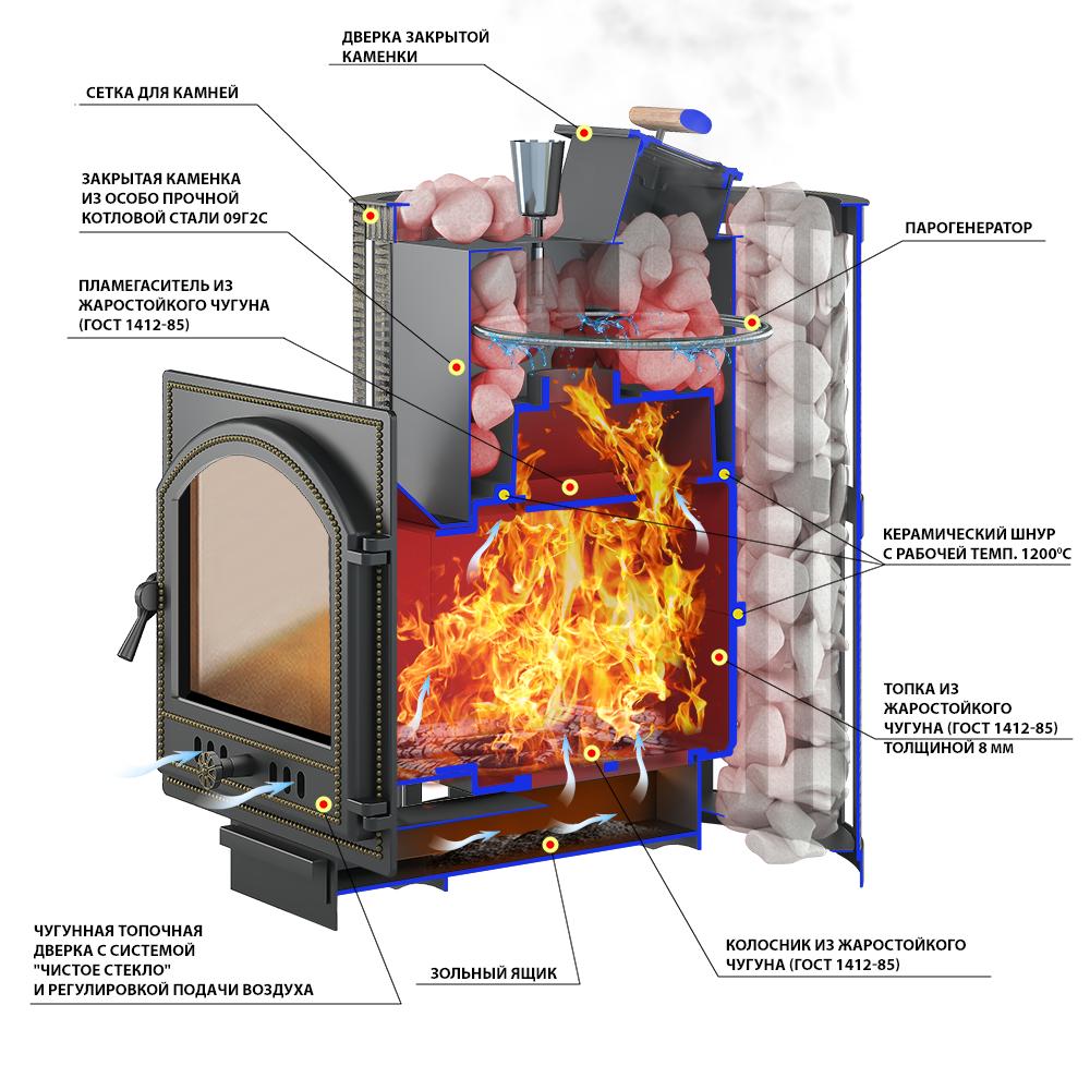 Закрытая каменка изготовлена из особо прочной котловой стали (09Г2С) и вмещает в себя не менее 60 кг камней.