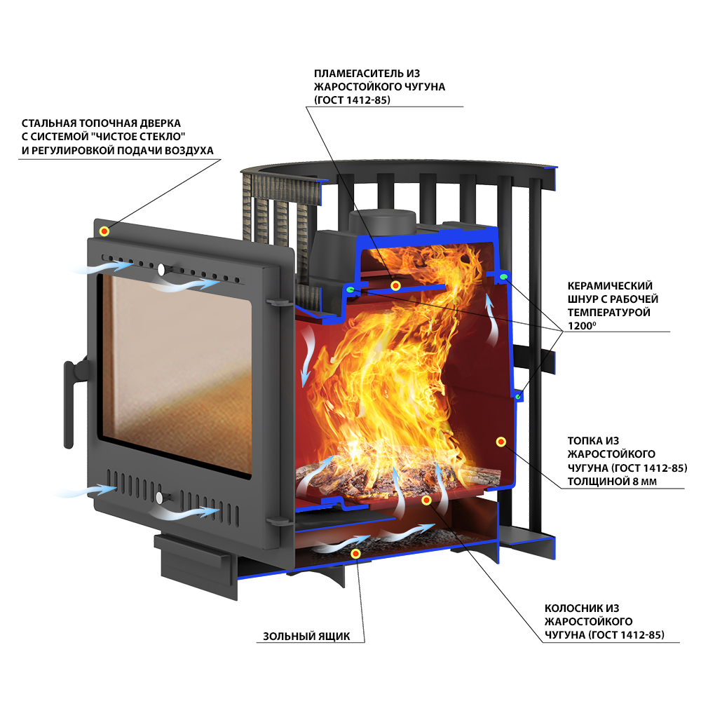 Преимущество печи в том, что топка печи состоит из 3-х элементов. На стыке между ними используется керамический шнур с рабочей температурой 1200 градусов. То есть топка печи абсолютно герметична! Для фиксации деталей между собой применяется болтовое соединение, что даёт 100% гарантию безопасности при эксплуатации.