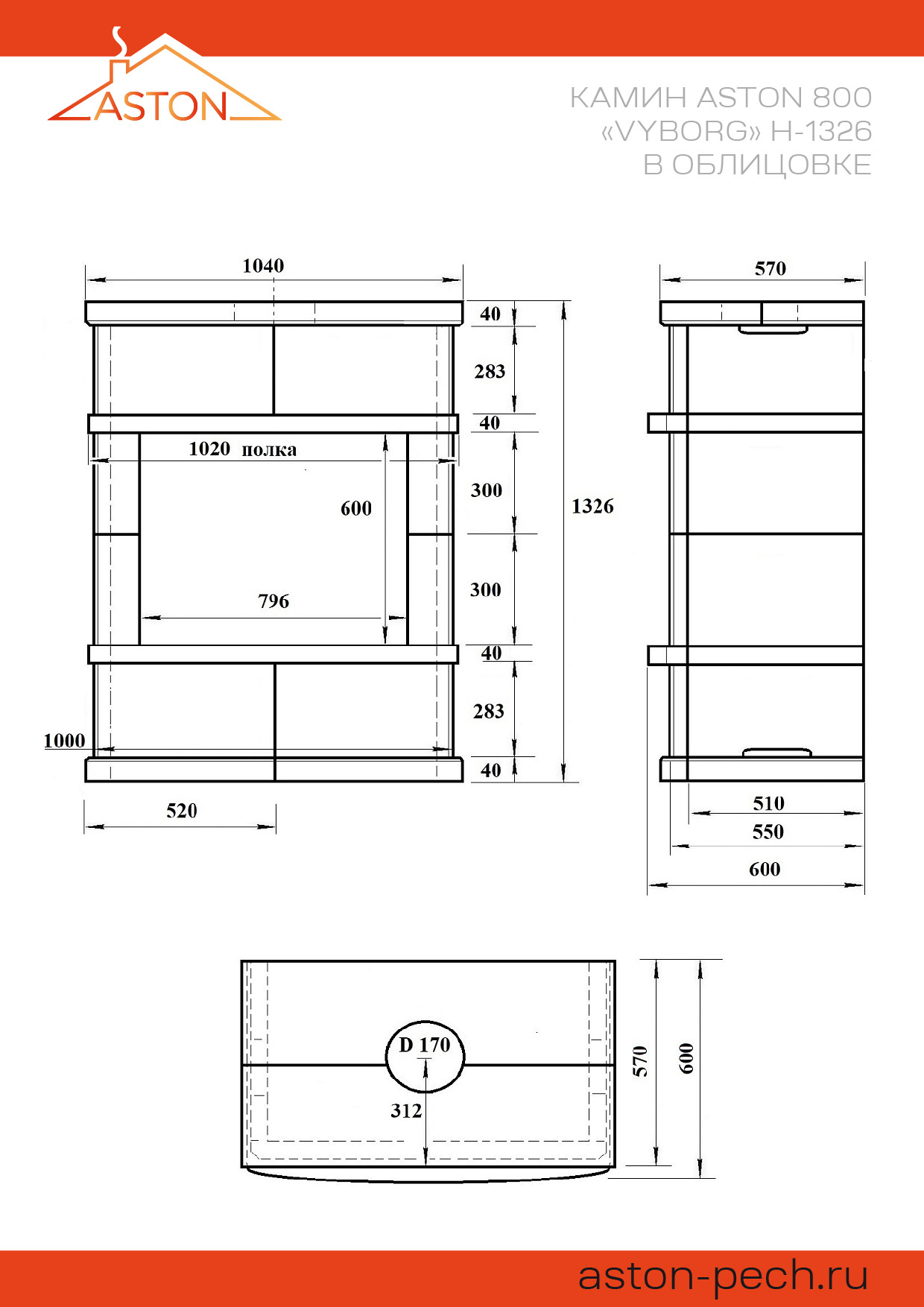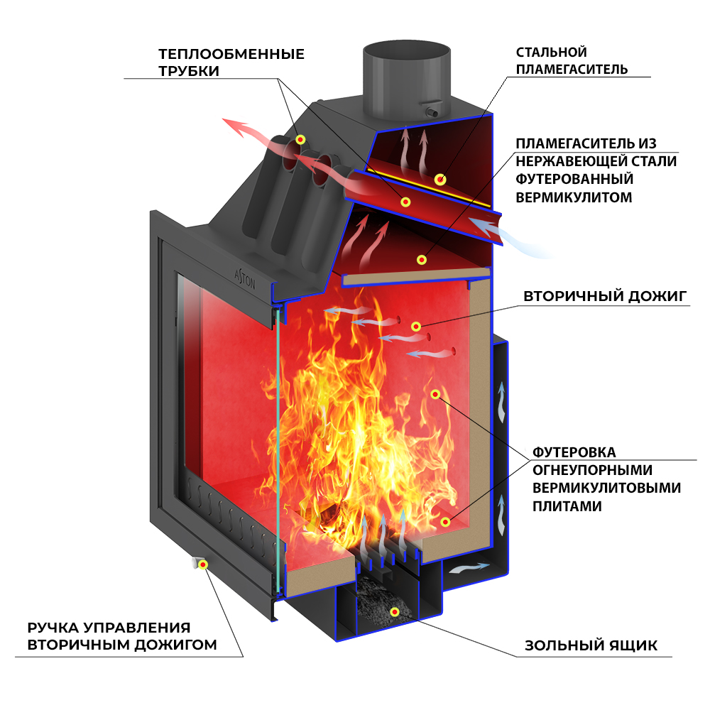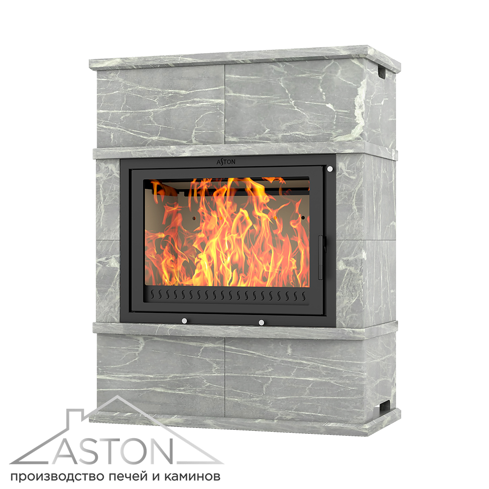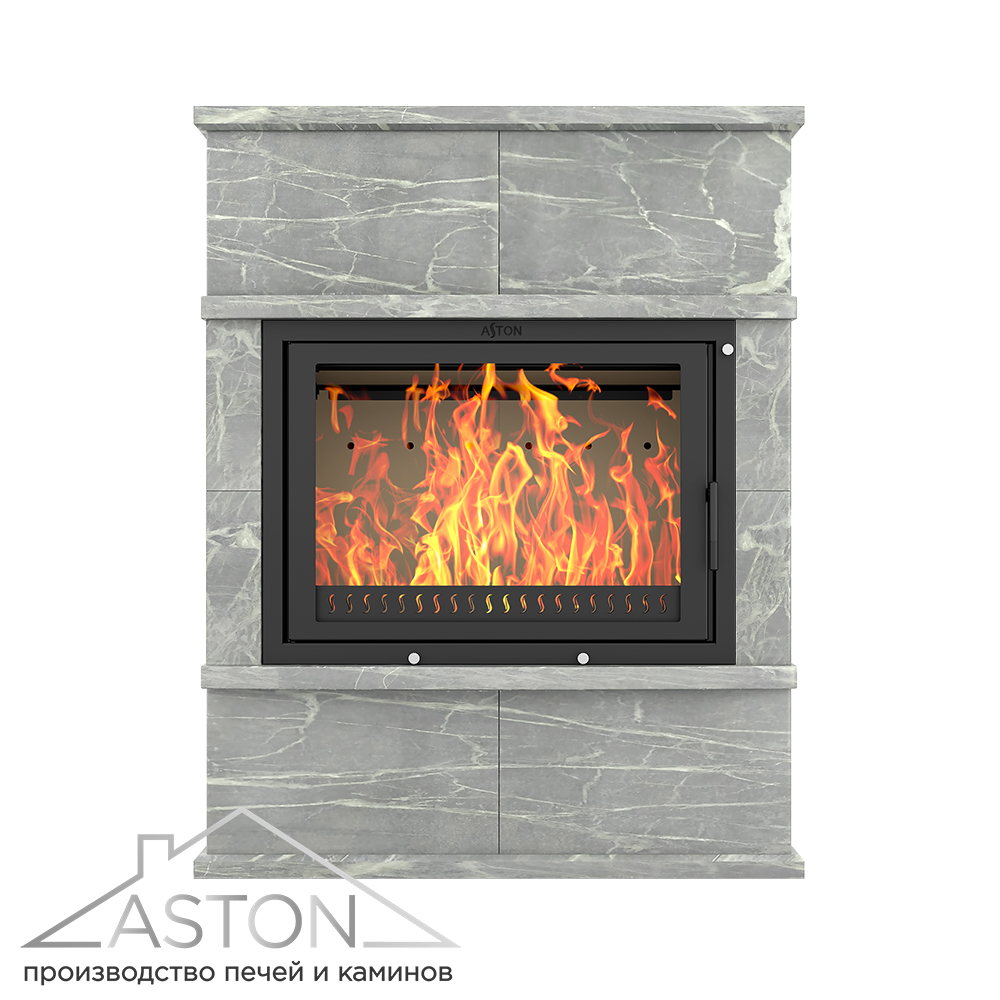 Топка Астон 800 внутри облицовки размещается на подставке. Топка, подставка и облицовка отлично походят друг к другу и не требуют дополнительной подгонки. Свободное пространство между топкой и облицовкой предназначено для движения нагретого воздуха. Именно за счёт конвекции быстро нагревается пространство, что уже в первые минуты работы топки обеспечивает тепло в помещении.