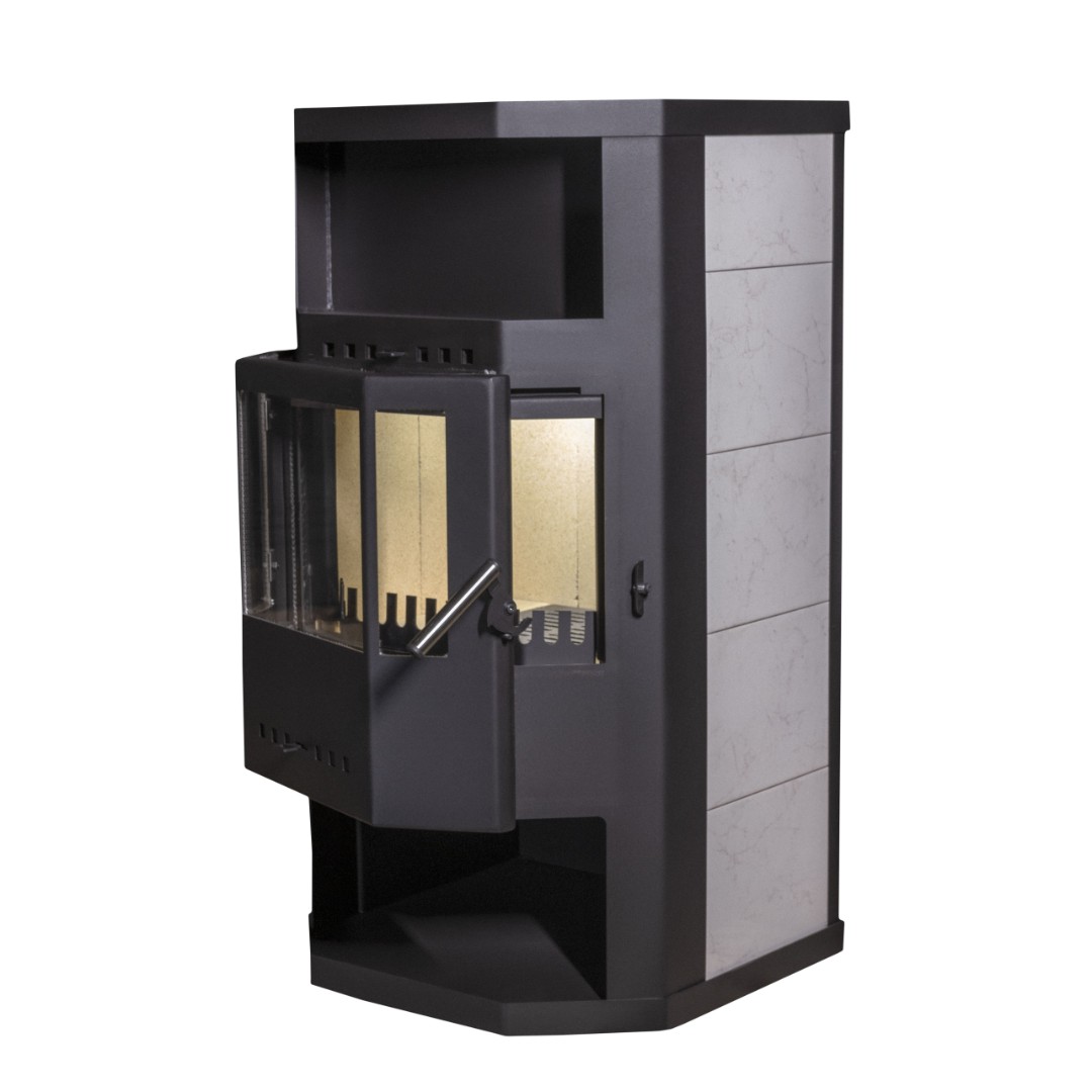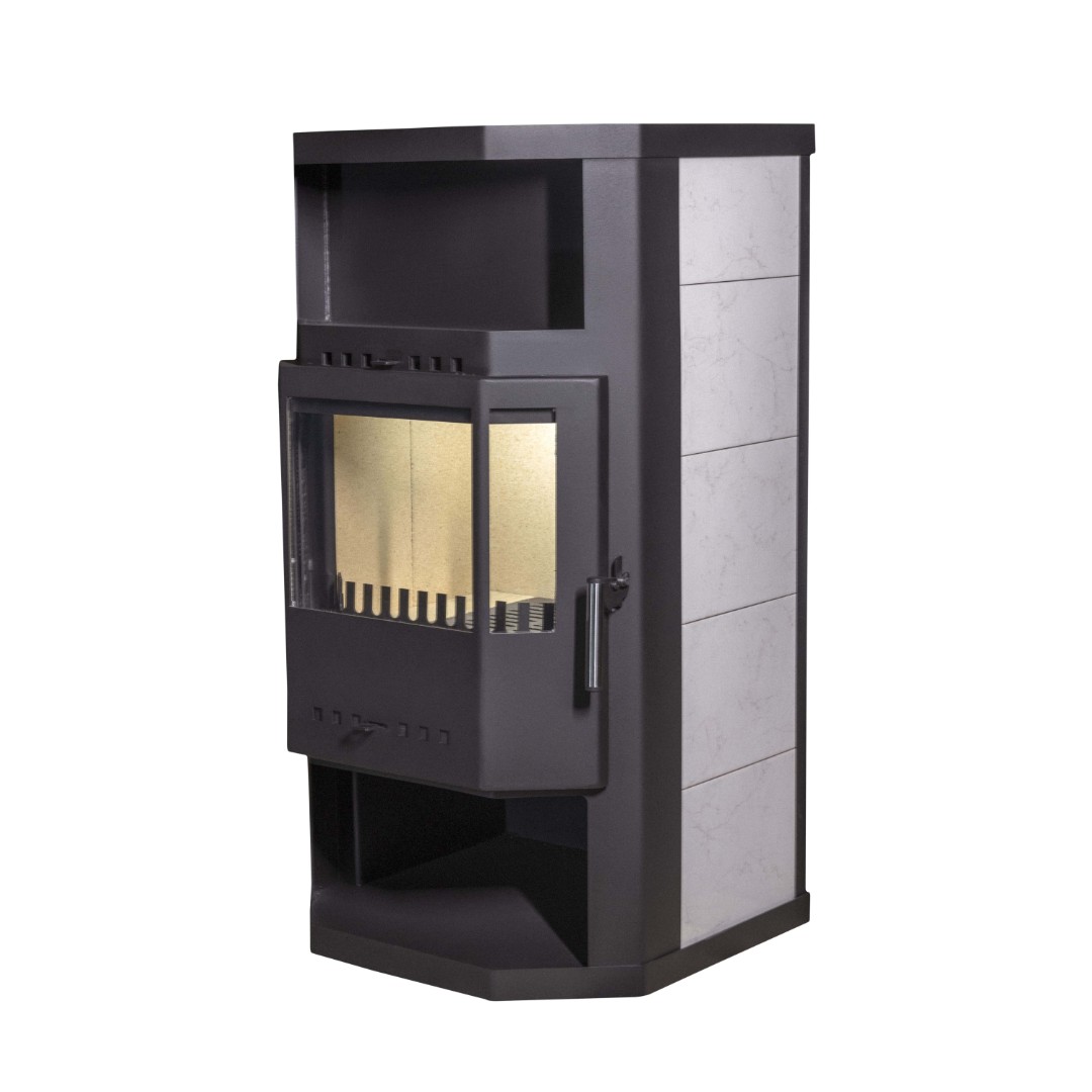 Стальная печь-камин “Ангара” с призматическим остеклением дверцы топки и облицовкой из керамической плитки с легкостью справится с обогревом помещения объемом до 180 куб. метров. Вытянутый вверх корпус позволяет установить печь как у стены, так и в углу, а дымоход вывести сверху или сзади, по желанию владельца.