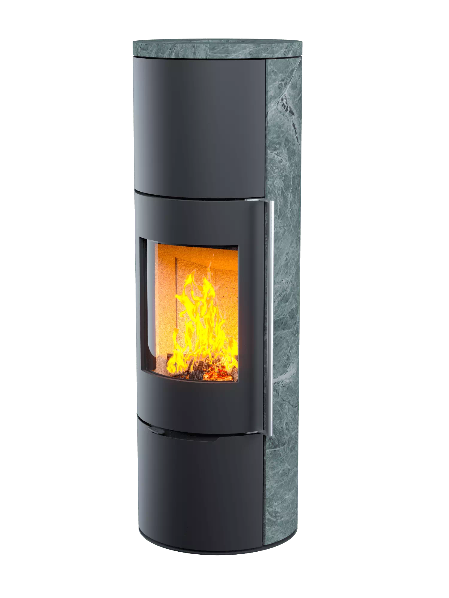 Печь-камин Астов R1.0 XL К с каменными панелями 3 варианта: Талькомагнезит, Крема беж, Песчанник и круглой задней стенкой, c максимальной панорамой пламени создает прекрасный вид на огонь из любой точки помещения. Лаконичный дизайн, минимальная сложность ввода в эксплуатацию и минимальная нагрузка на установочную поверхность.