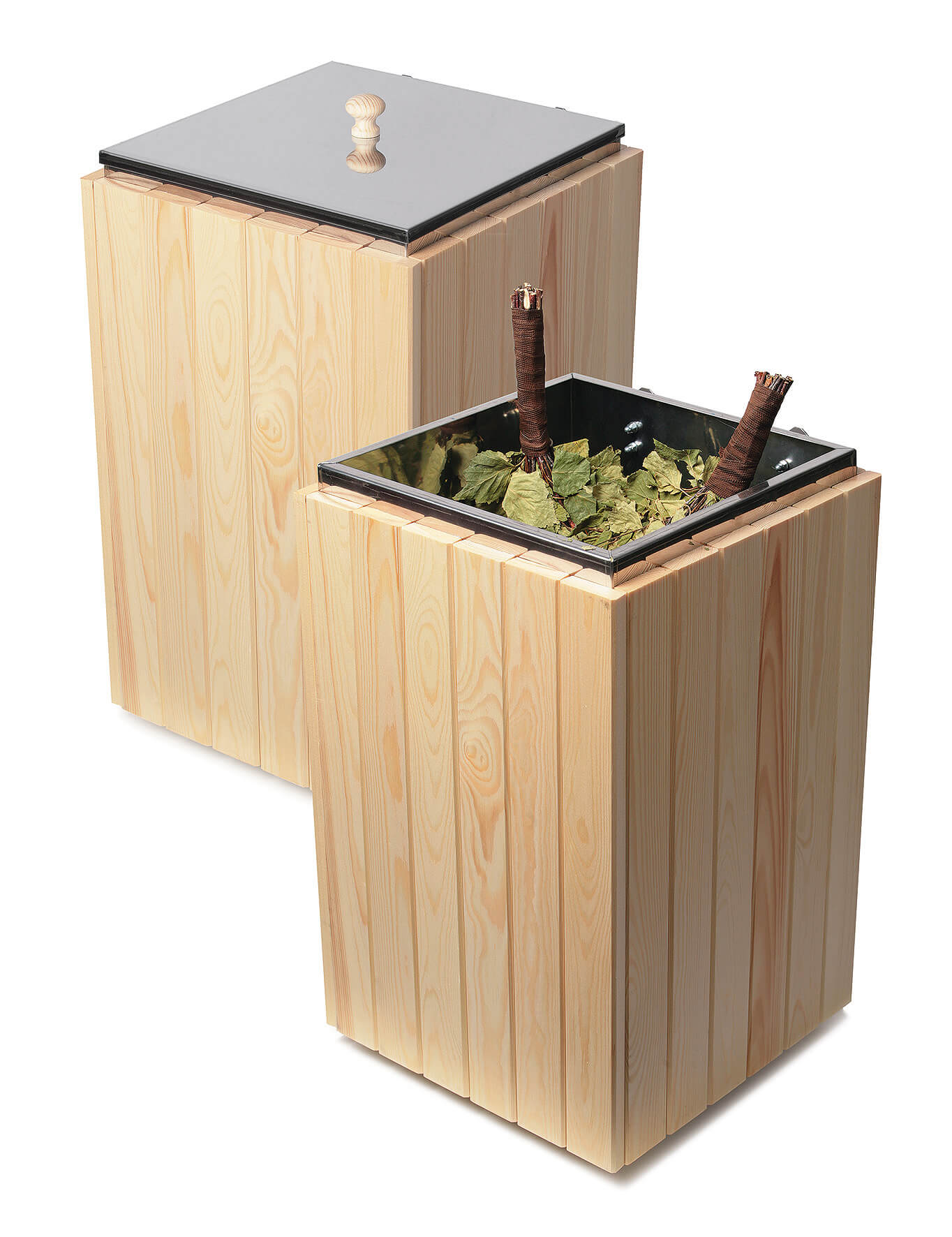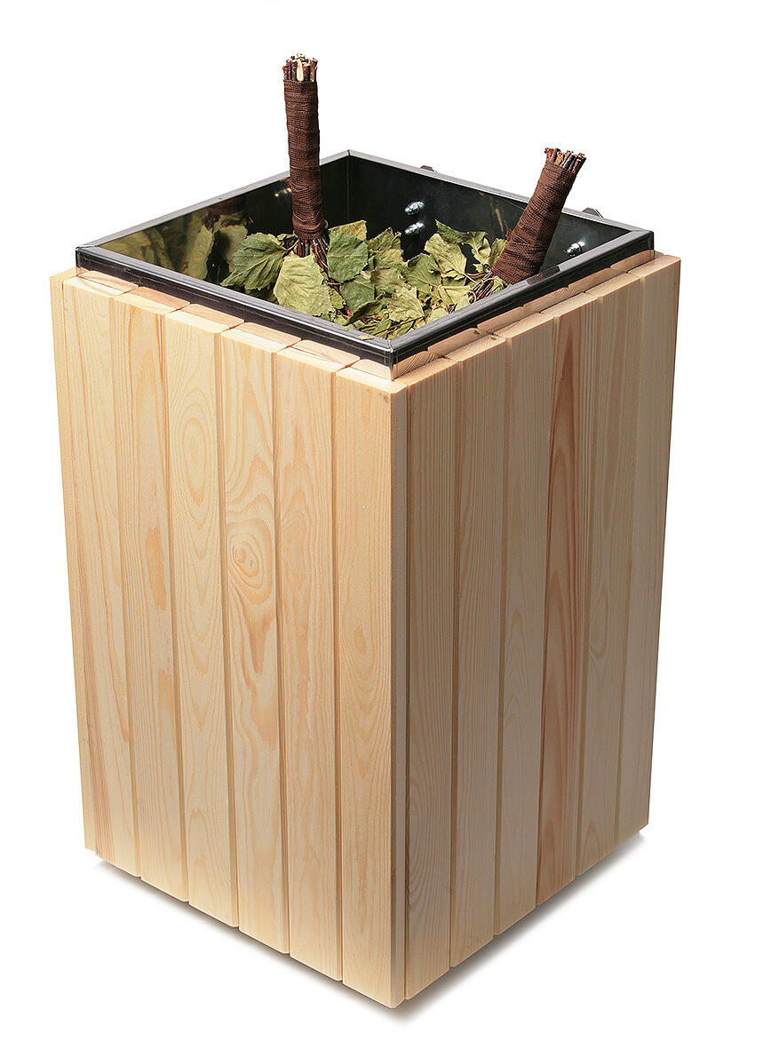 На дне изделия находится перфорированная решетка, препятствующая погружению веников в воду.